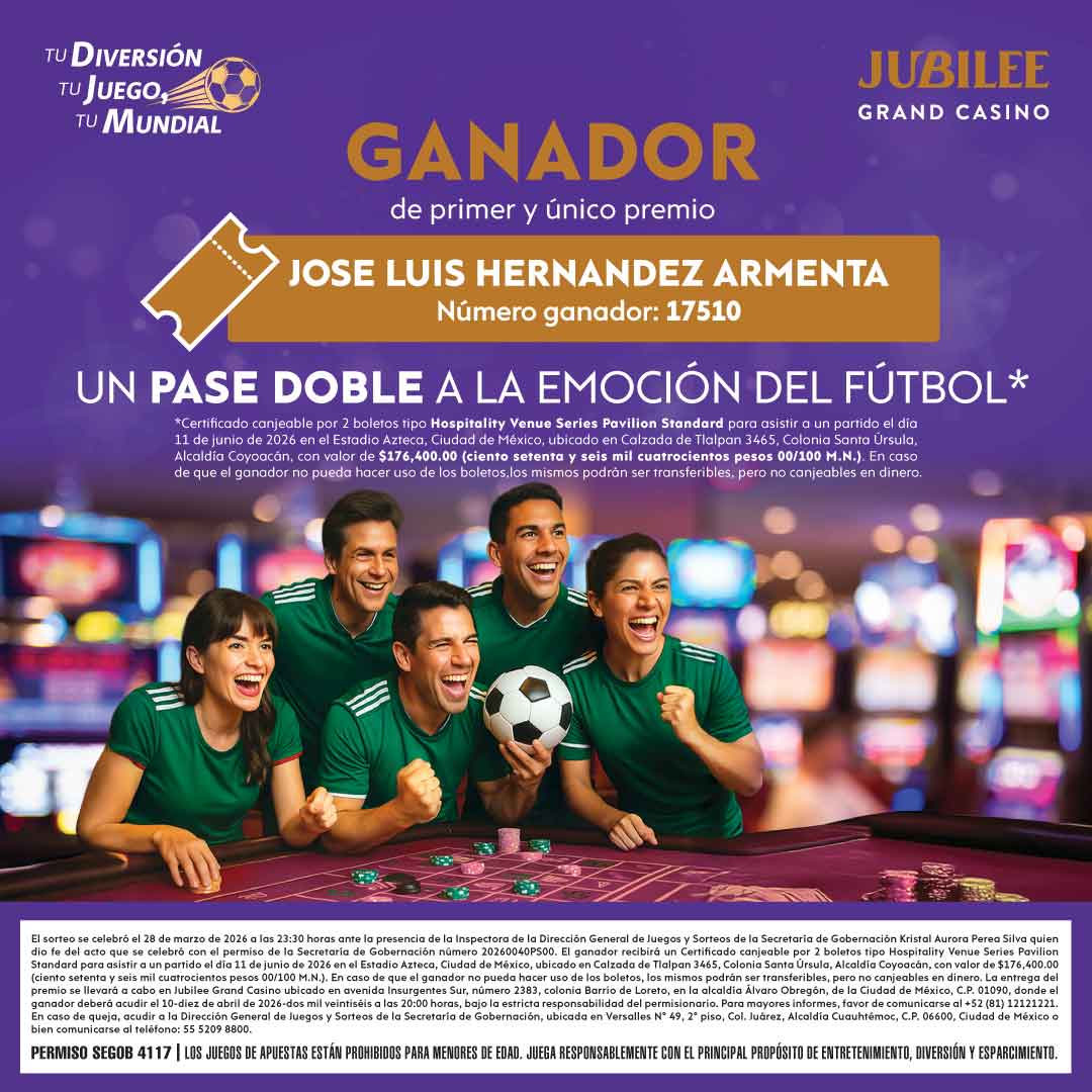 El Sorteo TU DIVERSIÓN, TU JUEGO, TU MUNDIAL, estará sujeto a las bases, reglas y premios autorizados por la Secretaría de Gobernación. *Descripción del premio: Certificado canjeable por dos boletos tipo Hospitality Venue Series Champions Club Standard+ para asistir a un partido del Mundial, en el Estadio Monterrey, ubicado en Avenida Pablo Livas 2011, Colonia La Pastora, C.P. 67140, Guadalupe, Nuevo León el día 20 de junio de 2026. Incluye transportación aérea (vuelo redondo Cancún-Monterrey) y hospedaje (2 noches habitación doble en 3 estrellas). El viaje puede ser transferible, pero no canjeable en dinero, con valor de $173,400.00 (ciento setenta y tres mil cuatrocientos pesos 00/100 M.N.). Vigencia del permiso: 01 al 28 de marzo del 2026. Periodo permitido para la distribución de folios: 01 al 28 de marzo del 2026 hasta las 22:30 horas. El sorteo se llevará a cabo el 28 de marzo de 2026 a las 23:30 horas en el Establecimiento Autorizado denominado Jubilee Casino, ubicado en Avenida Tulum, Supermanzana 8, Manzana 1, Lote 2, Subcentro Urbano, Cancún, Quintana Roo, C.P. 77504. Acceso libre y gratuito al público en general, al evento del sorteo. Mecánica del sorteo: Para la realización del sorteo en el establecimiento Jubilee Casino, se utilizará una tómbola conformada por 5 (cinco) ánforas alineadas de izquierda a derecha de frente al cliente, las cuales contendrán la siguiente numeración: - Ánfora 1 (Decenas de Millar): 8 esferas, numeradas del 0 al 7. -Ánfora 2 (Unidades de Millar): 10 esferas, numeradas del 0 al 9. – Ánfora 3 (Centenas): 10 esferas, numeradas del 0 al 9. -Ánfora 4 (Decenas): 10 esferas, numeradas del 0 al 9. -Ánfora 5 (Unidades): 10 esferas, numeradas del 0 al 9. La formación del número ganador y lectura del mismo, será de izquierda a derecha, comenzando por el ánfora número 1 (Decenas de Millar) y terminando con el ánfora número 5 (Unidades). En caso de que se obtenga de las cinco ánforas el número 00000 (cinco ceros), este corresponderá al folio de participación 80,000 (ochenta mil), de esta manera se podrá formar todos los números de la emisión. Los resultados oficiales del Sorteo se publicarán el día 30-treinta de marzo de 2026-dos mil veintiséis y a través de los medios de difusión que se indican a continuación: Periódico Milenio (formato impreso), página de internet https://cancun.jubileecasino.mx/ y redes sociales: Facebook https://www.facebook.com/JubileeCancun e Instagram https://www.instagram.com/JubileeCancun/